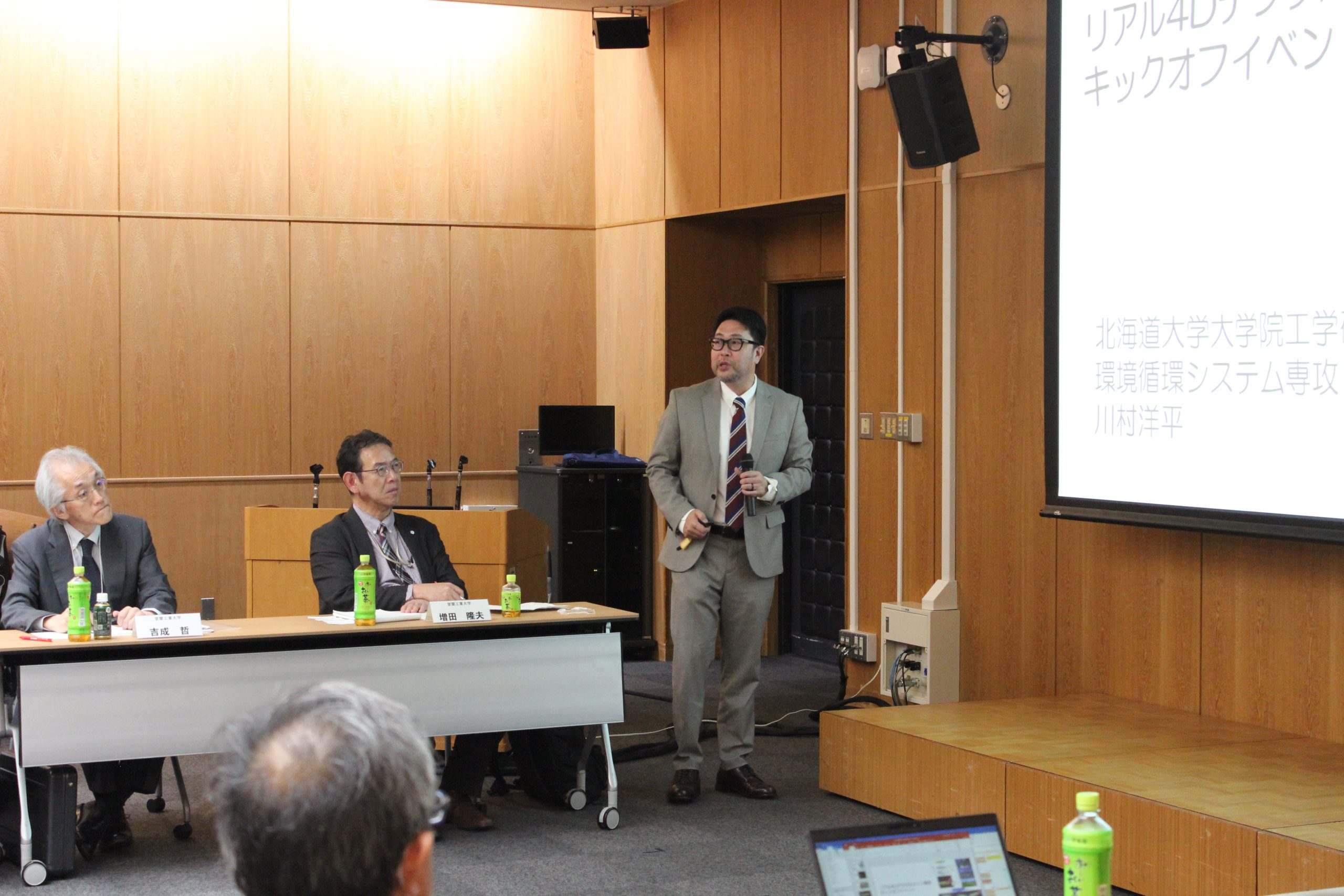 本取り組みでは、水産業が盛んな噴火湾地域をモデルとして、地域の強靭化に資する「HOKKAIDO(噴火湾)デジタルツイン」の基盤を構築します。室蘭工業大学を中心に、北海道大学(工学部・水産学部)などが協働し、特に北海道大学工学部の資源マネジメント研究室がデジタルツイン構築を主に担当します。川村洋平教授がこのイベントに登壇しました。